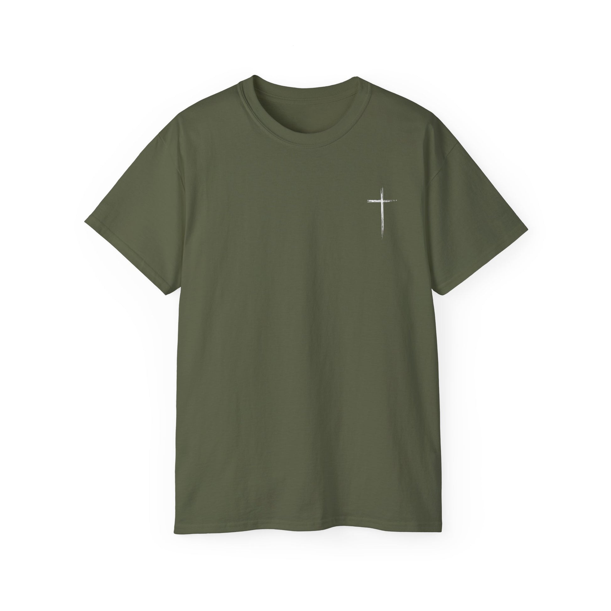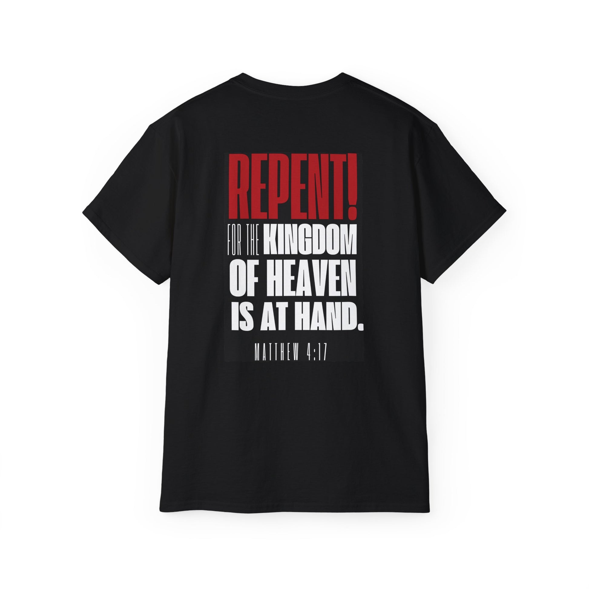 Repent | Matthew 4:17 Mens Ultra Cotton Tee unisex ultra cotton tee is a classic. Quality cotton construction means that designs are sure to shine. The shoulders are tapped for a good upper-body fit. There are no side seams, ensuring a clean, unbroken flow. The collar has ribbed knitting for improved elasticity. The materials that went into this product are sustainably sourced and economically friendly.